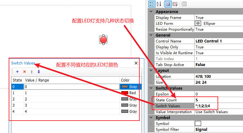 - 以不同的 LED 灯颜色指示关联信号或变量的不同值。