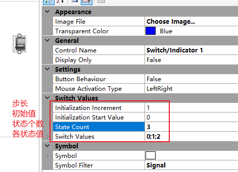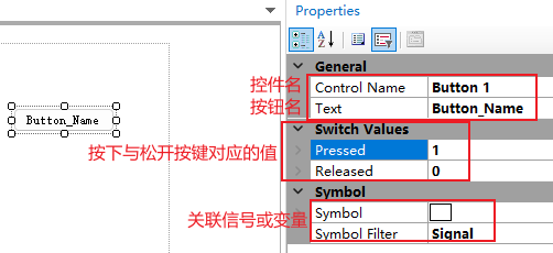 - 开关按钮,按钮按下时与松开时的值不同。主要设置的参数有:按下与松开按键对应的值、关联的变量、按键名。
