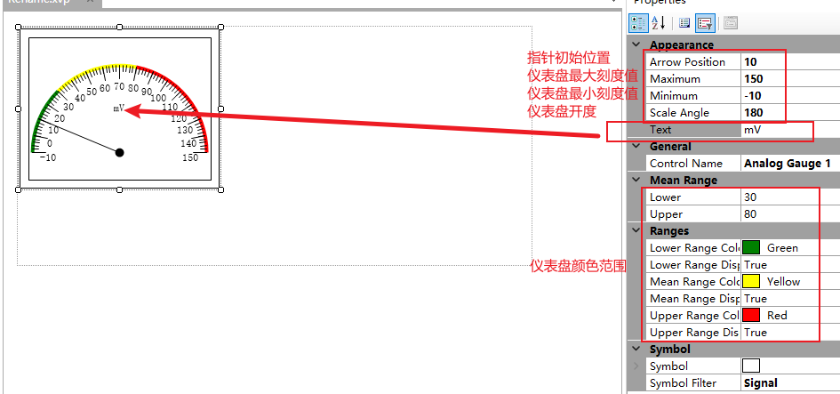- 用于将数据的数值以仪表盘的形式显示(一般用于显示车速、转速等信号值),主要设置的参数有:关联的变量、变量值范围及扇形角度、单位等。