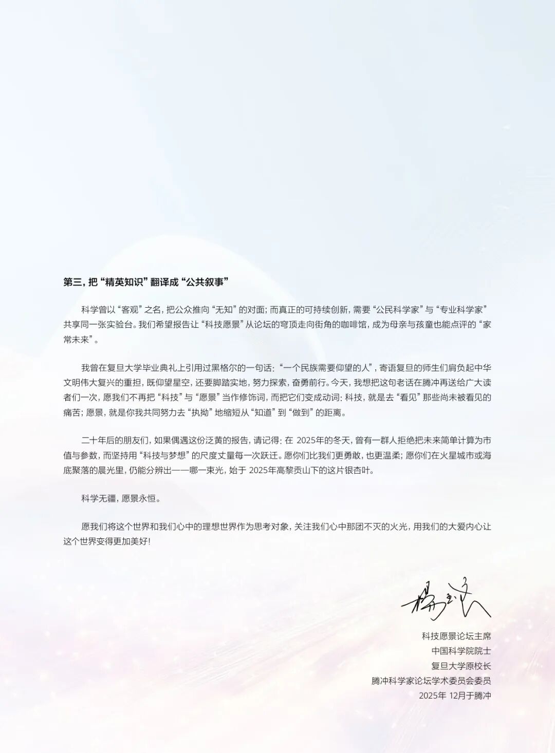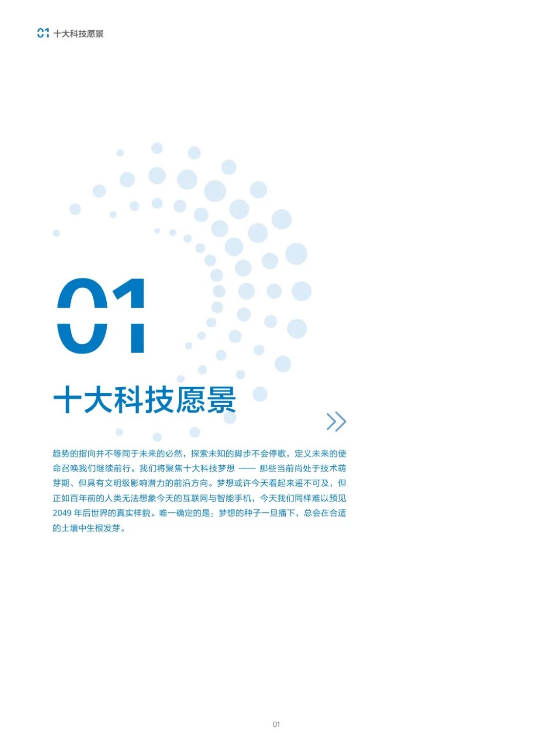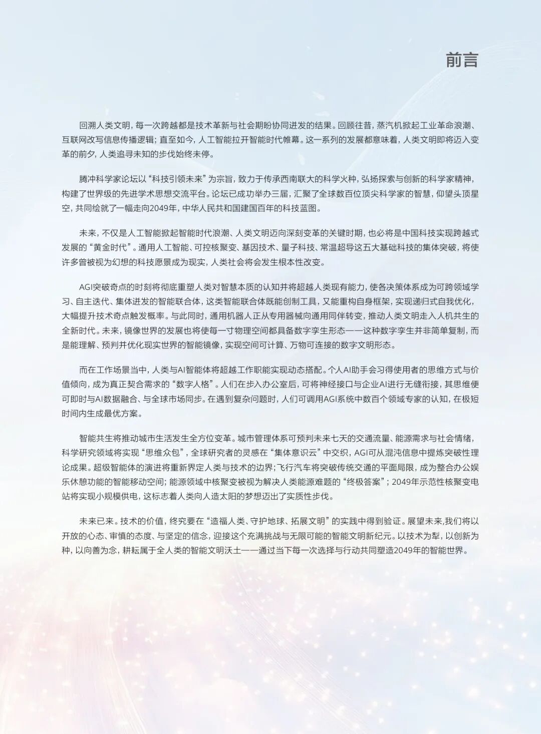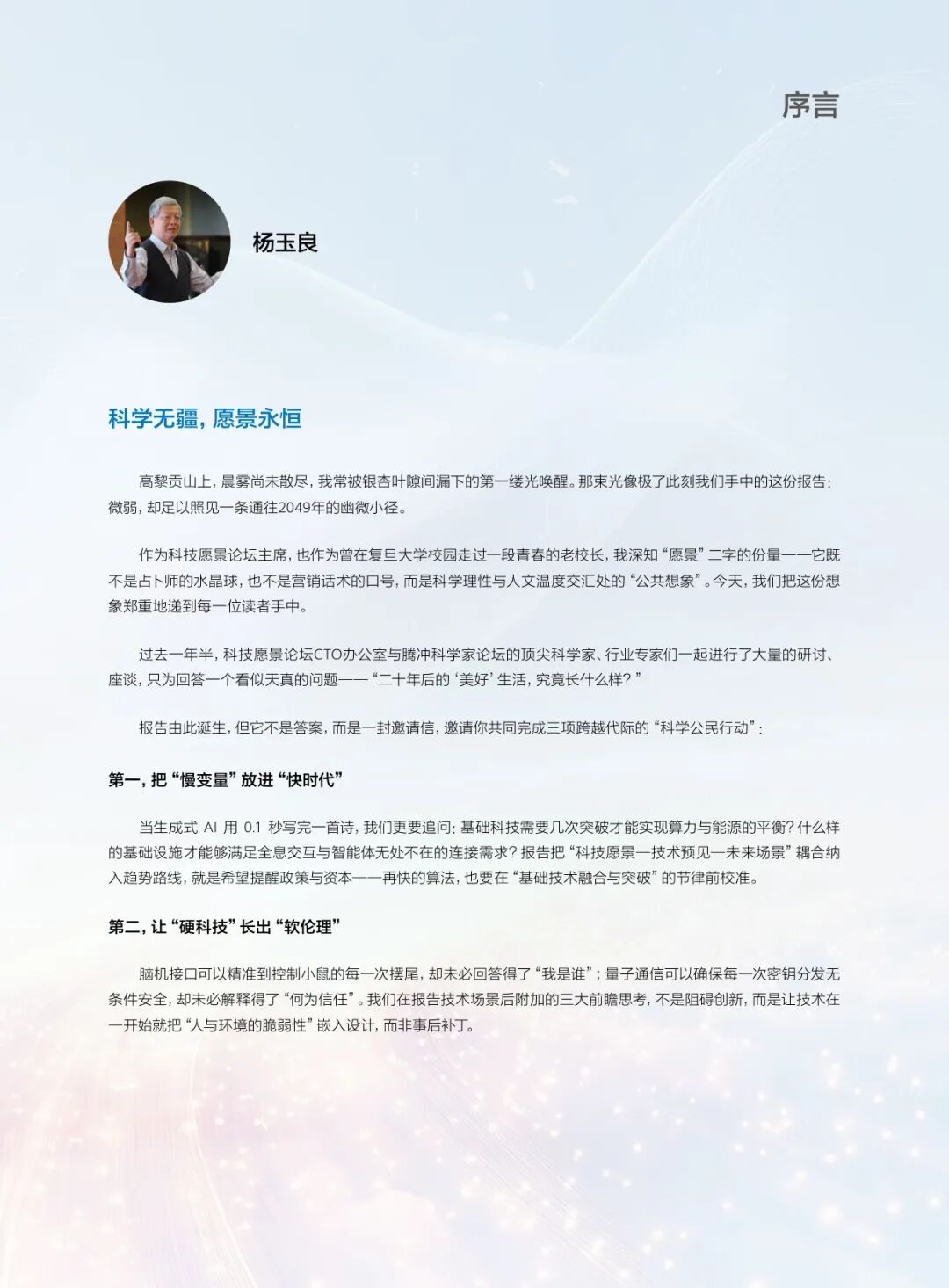 《科技预见与未来愿景2049》由科技愿景论坛联合全球顶尖科学家与产业专家共同编制,立足2025年,展望中华人民共和国建国百年之际的2049年,系统描绘了以人工智能、量子科技、生命科学、能源革命和材料突破为核心的十大科技愿景与十大未来场景,并提出三大前瞻思考,旨在推动科技向善、以人为本的文明跃迁。