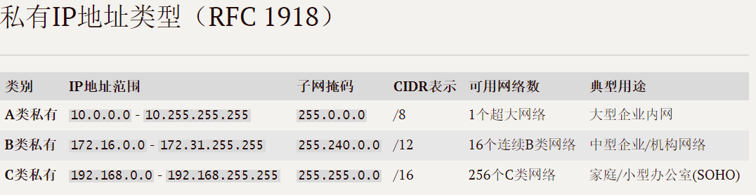 这里我们先来回顾下私网IP。如果一个组织内部组建局域网,IP 地址只用于局域网内的通信,而不直接连到 Internet 上,理论上使用任意的 IP 地址都可以,但是 RFC 1918 规定了用于组建局域网的私有 IP 地址。
