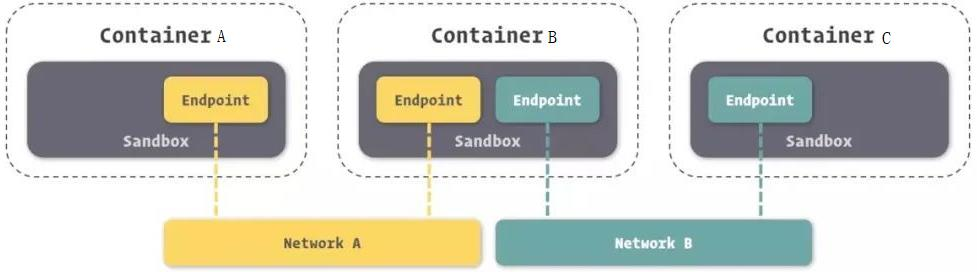 如上图所示,容器 B 有两个 Endpoint 并且分别接入 Networkd A 和 Network B。那么容器 A 和容器 B 之间是可以实现通信的,因为都接入了 NetworkA。但是容器 A 和容器 C 不可以通过容器 B 的两个 Endpoint 通信。