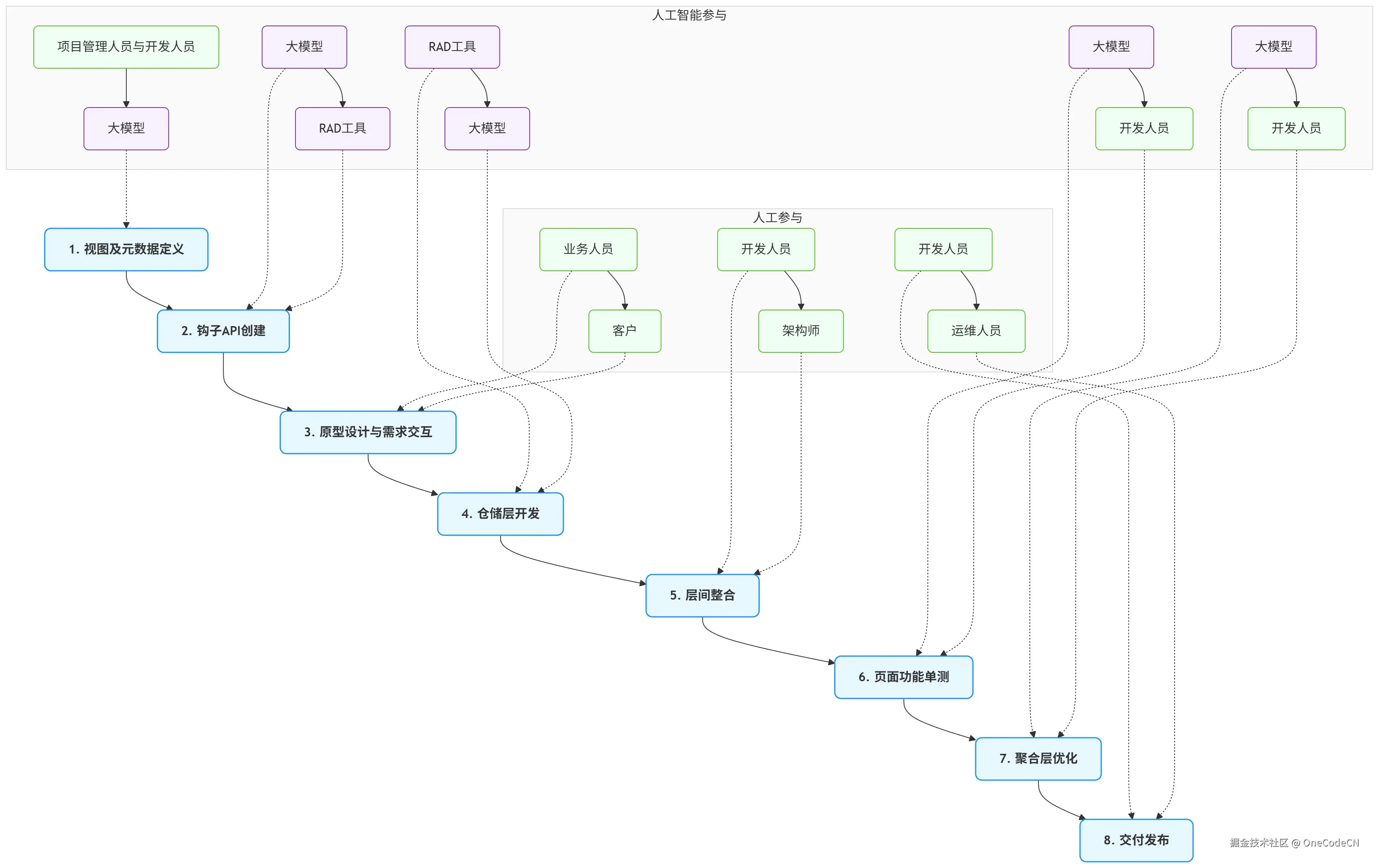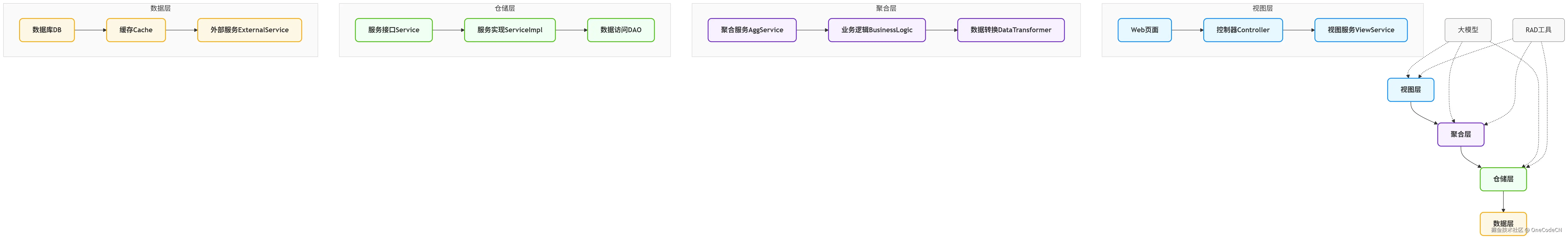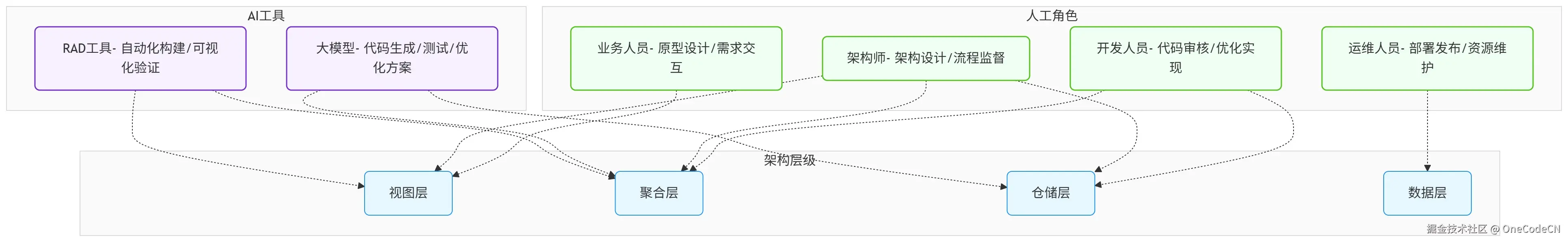 图形注解:1. 协同逻辑:人工角色与AI工具围绕架构层级分工协作,人工聚焦需求、审核、设计、运维等核心决策环节,AI工具聚焦代码生成、自动化构建等重复性工作;2. 重点协同:大模型主要支撑聚合层、仓储层的开发优化,RAD工具主要支撑视图层、聚合层的自动化构建;3. 价值体现:通过"人工决策+AI赋能"的协同模式,兼顾决策准确性与开发效率,适配企业级项目的复杂需求。