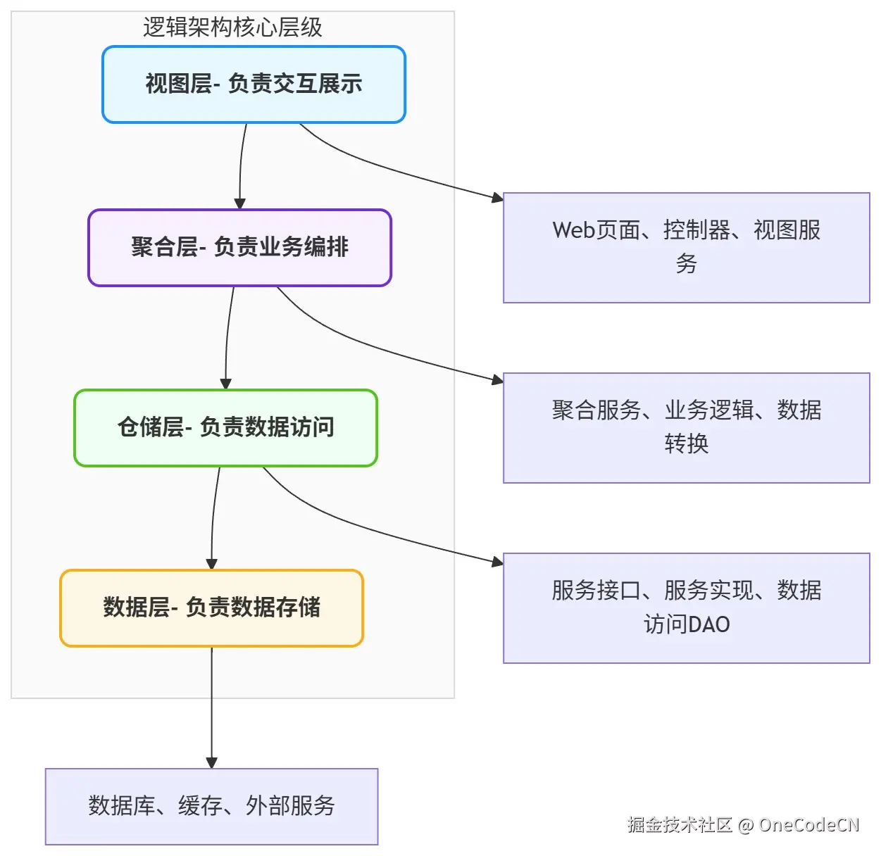 图形注解:1. 核心逻辑:自上而下的依赖关系,视图层接收用户请求,通过聚合层编排业务逻辑,由仓储层获取数据层资源,实现"展示-业务-数据"的完整链路;2. 层内组件:每个层级包含核心功能组件,明确各层的职责边界,确保高内聚低耦合;3. 设计目的:通过逻辑分层,使业务逻辑与数据访问分离,便于后续维护和迭代。