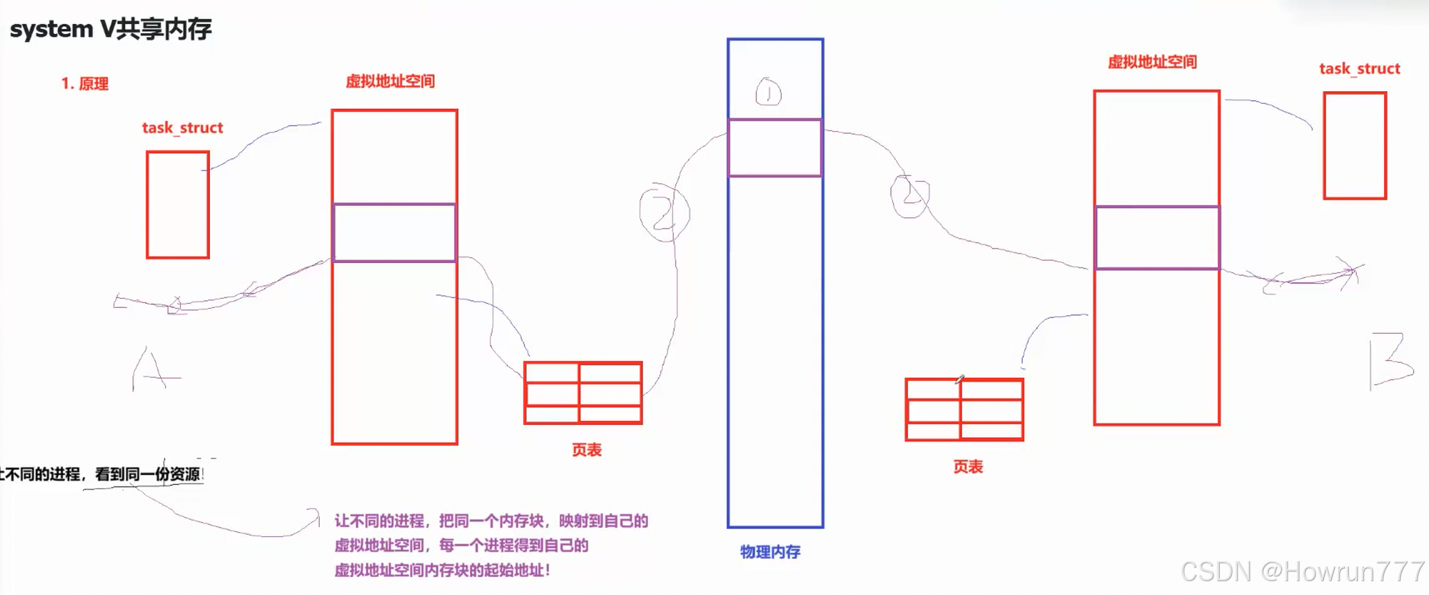 shmget(),内核在物理内存中分配一块连续区域,初始化shmid_ds;- 映射到进程空间 :进程调用