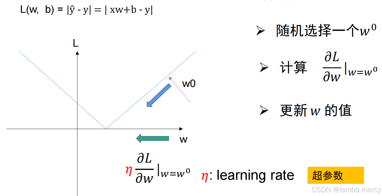 如果求出来的偏导小于0,说明随着w的减小,loss随之增大,应该增大w