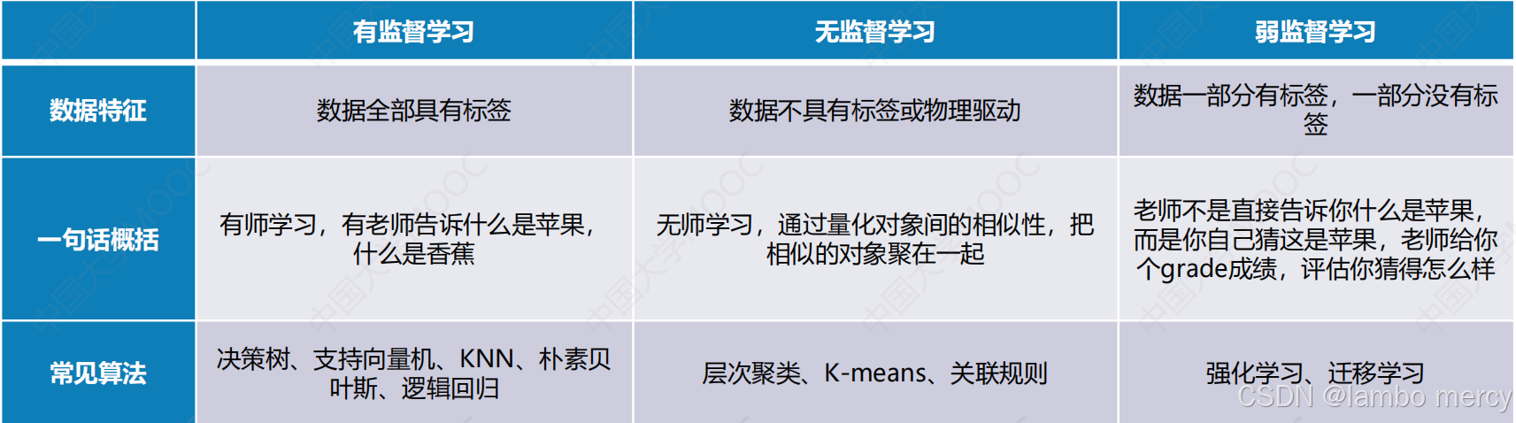 一般来说,我们会按照训练样本提供的信息以及反馈方式的不同,将机器学习算法大致分类为有监督学习、无监督学习和弱监督学习。(所谓的监督,你可以理解为一个标签)
