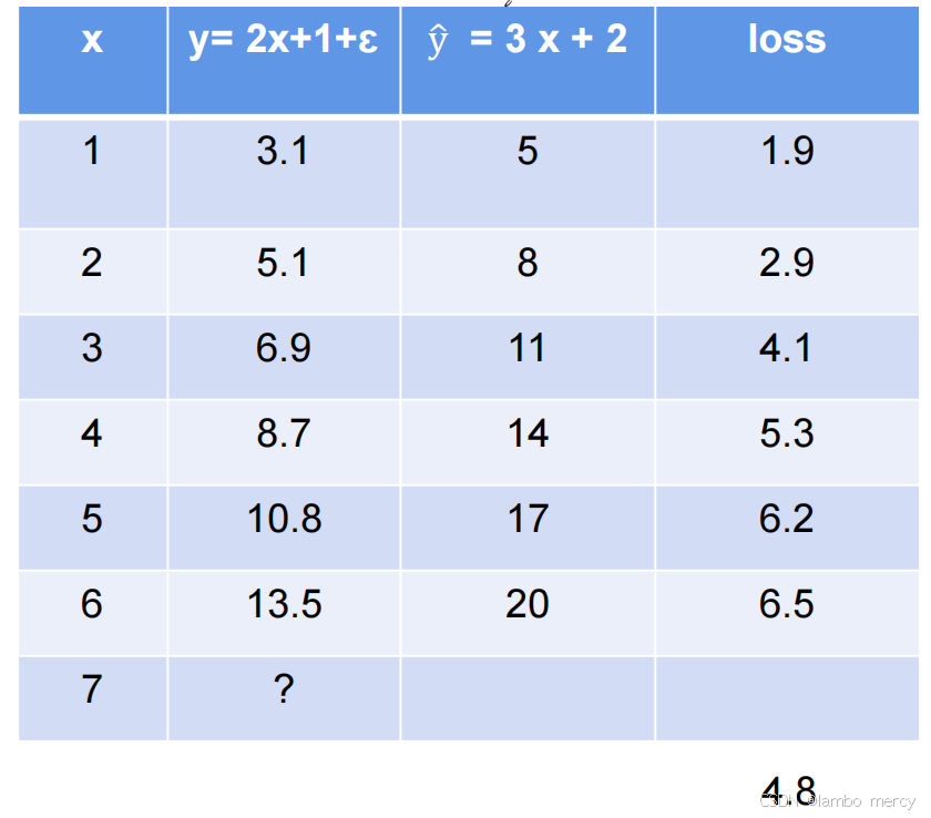 现在我们选取 𝑤 0 = 3、 𝑏 0 = 2 ,计算出每组数据对应的loss值,取平均得到的loss值为4.8,误差较大,需要优化