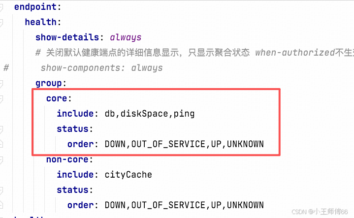 主要修改点:在management.endpoints.web.exposure.include中添加暴露端点:health-core,health-non-core