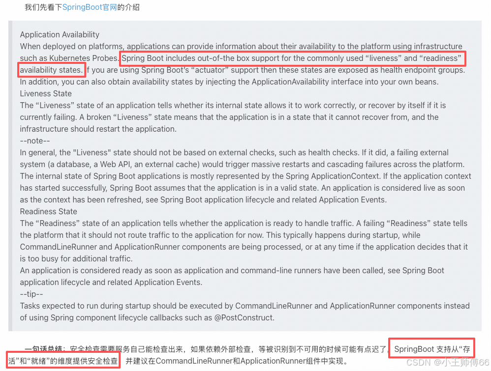 在 【轻松入门SpringBoot】actuator健康检查(上)中,我们层发过 SpringBoot 官网的解释,这里我们简单的过下这两个概念。存活:就是字面的意思,服务已启动,活着;就绪:是指可提供服务,"活着"和"能提供服务"是两码事,比如,服务已启动,但是线程池满了,那就提供不了服务。