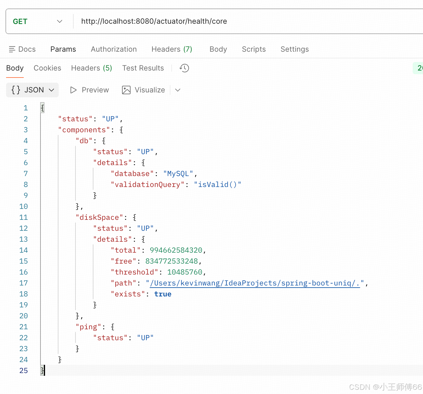 2、查看健康状态:http://localhost:8080/actuator/health