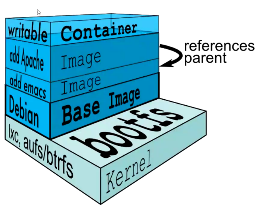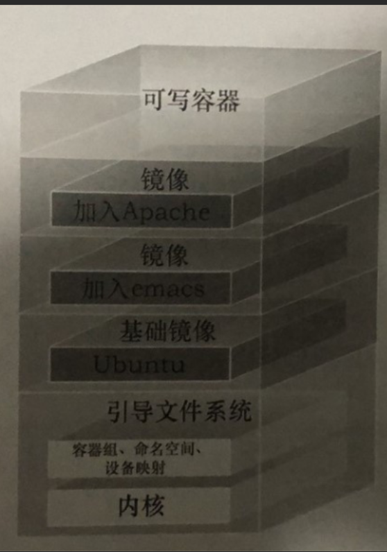 可以理解成一开始内核里什么都没有,操作一个命令下载debian,这时就会在内核上面加了一层基础镜像;再安装一个emacs,会在基础镜像上叠加一层image;接着再安装一个apache,又会在images上面再叠加一层image。