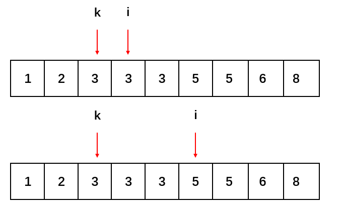 - 依旧用k表示有效元素的下标,当nums[i] == nums[k]时,就不予理会;当nums[i] != nums[k]时,就将nums[i]当前值保留下来。
