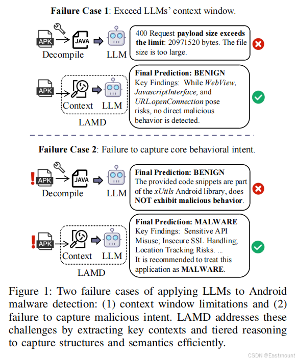 - 这篇论文试图解决什么样的问题:Android应用程序中广泛的支持代码,往往跨越数千个类,超出了LLMS的上下文限制,Android应用程序的结构复杂性和相关性超过了LLMS的基于序列的推理、碎片化的代码分析和阻止恶意意图推理。由此为应对挑战提出LAMD,一个实用的上下文驱动的框架来实现基于LLM的Android恶意软件检测。