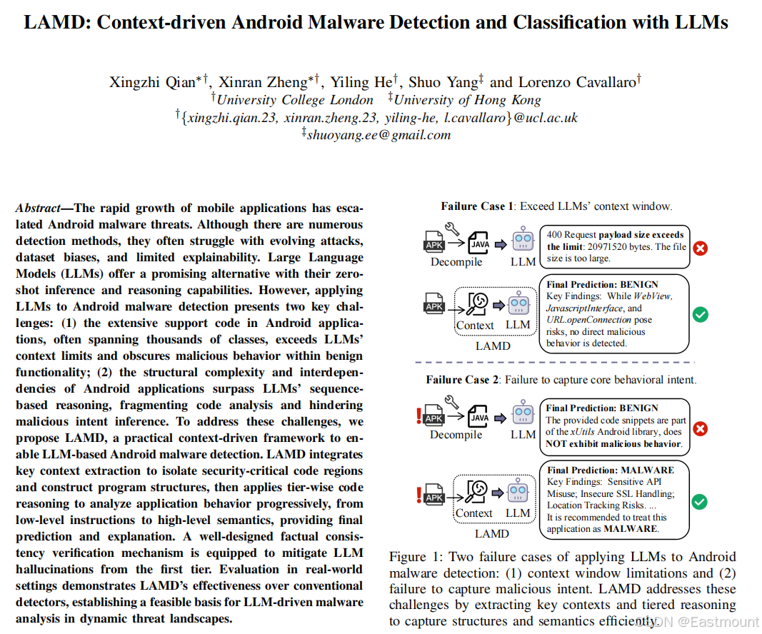 前一篇博客介绍了智能体与入侵检测结合的工作IDS-Agent,其是大语言模型(LLM)驱动的人工智能入侵检测Agent系统,特点是能够解释检测结果、进行自定义设置并适应零日攻击。本文将介绍LAMD,一种LLM上下文驱动的Android恶意软件检测框架,LAMD结合关键上下文提取来隔离安全关键代码区域并构建程序结构,然后应用分层代码推理从低级指令到高级语义逐步分析应用程序行为。注意,由于我们团队还在不断成长和学习中,写得不好的地方还请海涵,希望这篇文章对您有所帮助,这些大佬真值得我们学习。fighting!