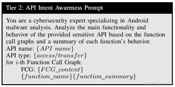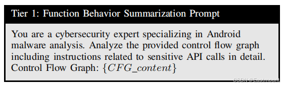 在前一阶段,提取几个调用可疑API的函数并将其切片以维护相关上下文。函数的每个切片CFG被馈送到LLM以捕获低级代码模式和功能。
