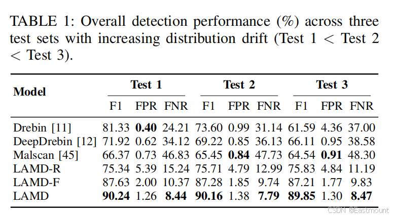 Malscan [52]在 Test 2 中 FPR 低至 0.73,Test 3 中 FPR 为 0.94,假阳性控制较好,但 F1 和 FNR 在偏移后也有一定波动。
