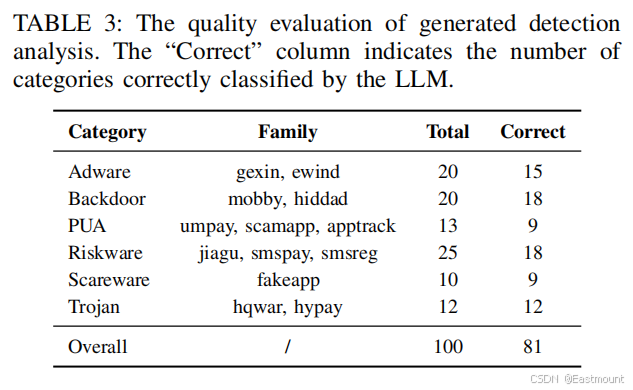 在表3中,Category表示恶意软件类别,Family表示该类别下的具体恶意软件家族,Total表示该类别下的样本总数,Correct表示LLM正确分类的样本数。