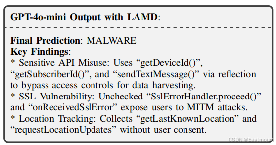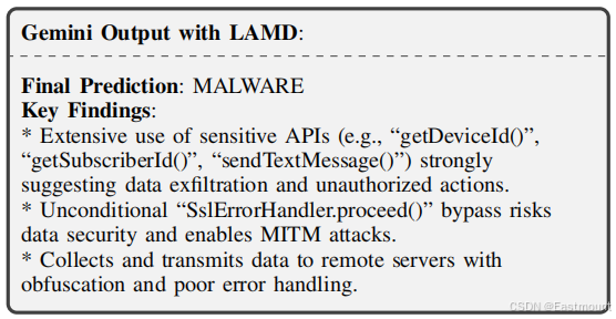 第二个案例聚焦于恶意行为意图被良性代码掩盖的情形。针对一个典型的 SMSReg 恶意软件样本,直接使用大模型分析时,由于大量第三方库和良性功能代码的干扰,模型错误地将样本判定为良性应用。LAMD 通过隔离与安全敏感 API 相关的关键程序结构,并结合分层代码推理机制,使模型能够识别出设备信息窃取、未授权短信发送、反射规避机制以及不安全 SSL 处理等核心恶意行为,从而实现对该样本的正确判定与行为解释。
