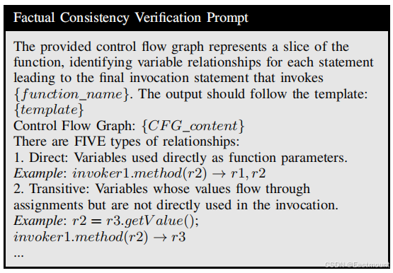 本文设计了一个结构化模板来捕获切片CFG中的数据依赖关系,为了加强推理,我们提示LLM根据特定的定义从输入函数中选择相应的数据关系,定义了五个依赖项:变量到API的交互(直接的、可传递的、有条件的)和变量间的关系(并行、派生)。前者跟踪变量如何通过赋值、调用链和控制流影响API执行,而后者捕获联合计算和派生。