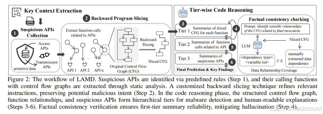 具体而言,我们对API执行静态分析,并使用定制的向后切片算法来提取关键变量、依赖项和预定义可疑API的调用。这些元素被转换为图形表示,过滤不相关的代码并保留LLM的基本语义,还引入了分层代码推理和事实一致性验证相结合的方法,跨多层传递结构化知识来理解和解释检测结果。