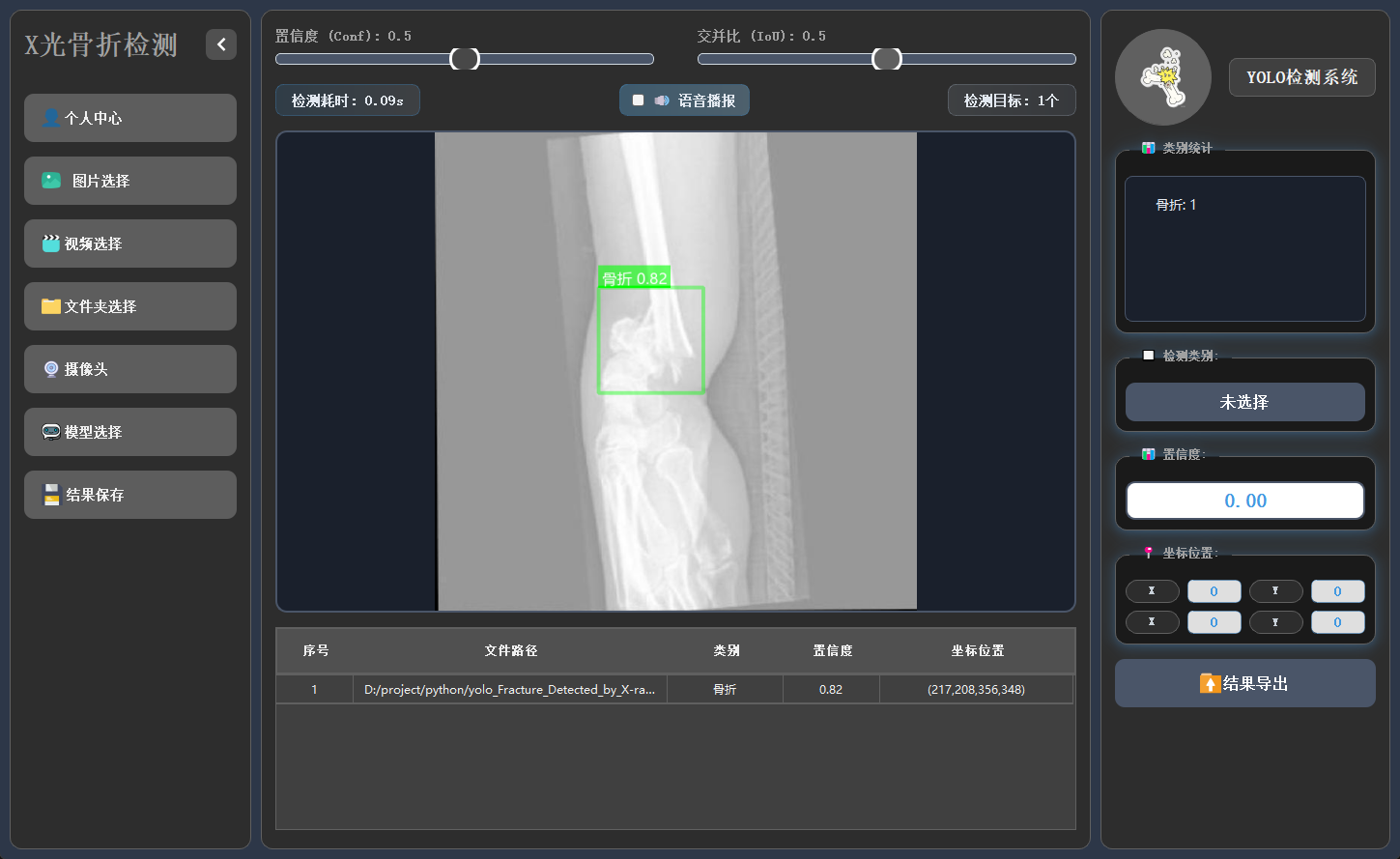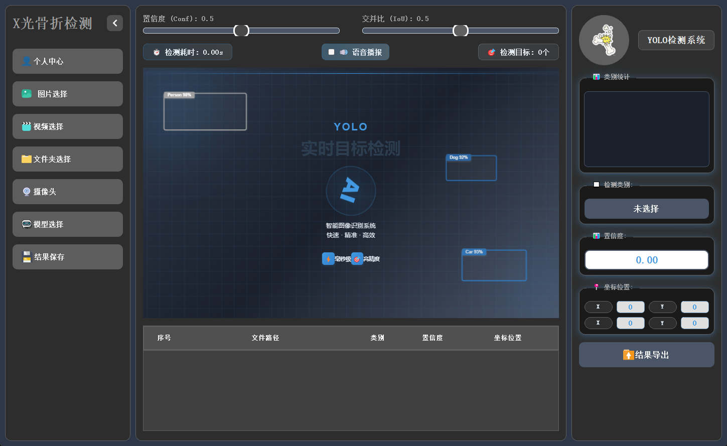 针对上述问题,本文设计并实现了一套 基于 YOLO 算法的 X 光骨折检测系统。该系统不仅能够对单张 X 光图片进行骨折检测,还支持视频逐帧检测、文件夹批量检测以及摄像头实时检测,并提供直观的可视化界面,方便医护人员快速查看和分析结果。系统同时集成登录与个人中心管理、检测结果导出、语音播报提醒等功能,提升可用性与交互体验。为进一步满足不同应用场景需求,系统还提供无界面脚本检测模式,便于在服务器或嵌入式设备中稳定运行。此外,配套的训练脚本支持用户基于自有数据训练定制化模型,涵盖数据加载、训练过程监控及结果可视化(如 F1 曲线、混淆矩阵等),形成从数据准备到模型应用的一体化解决方案。