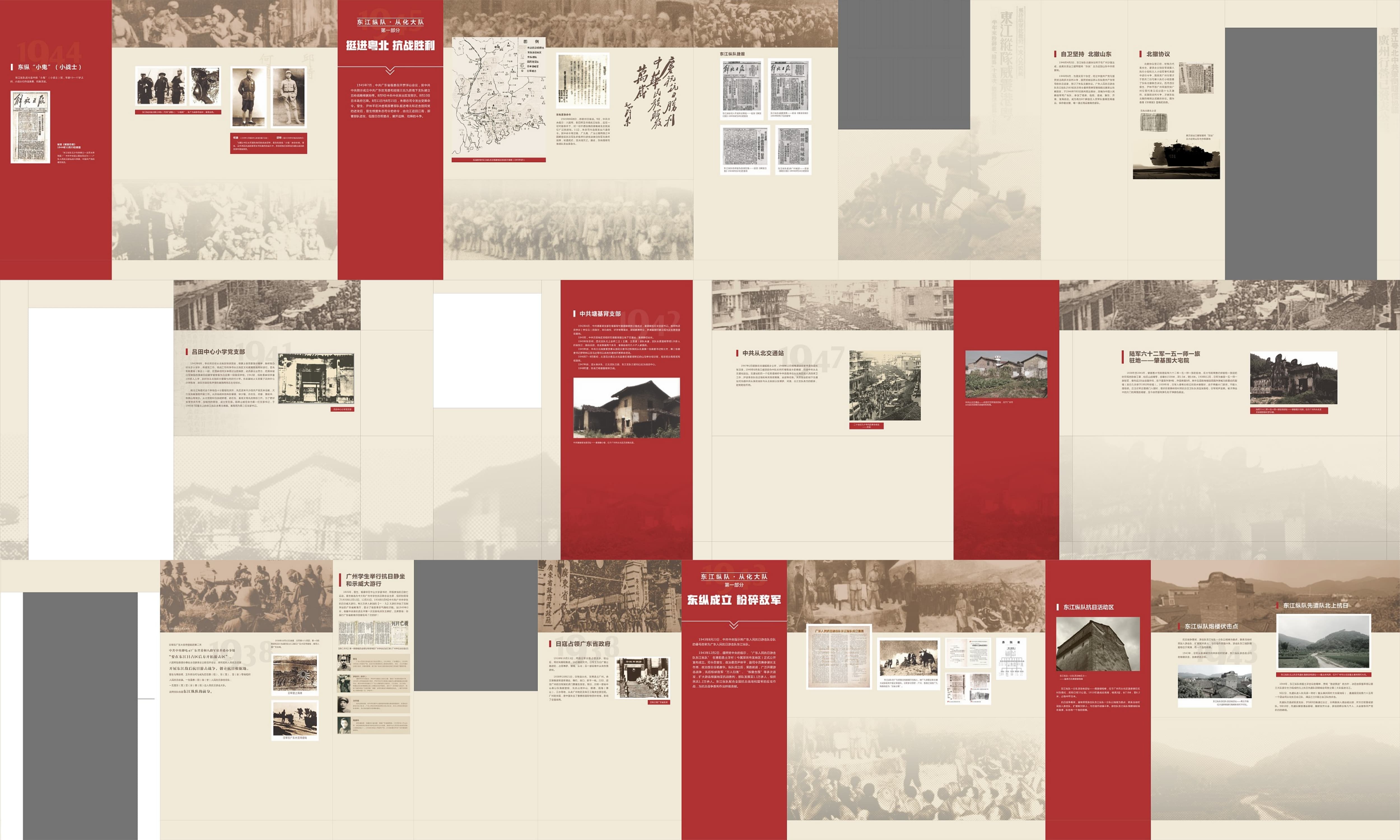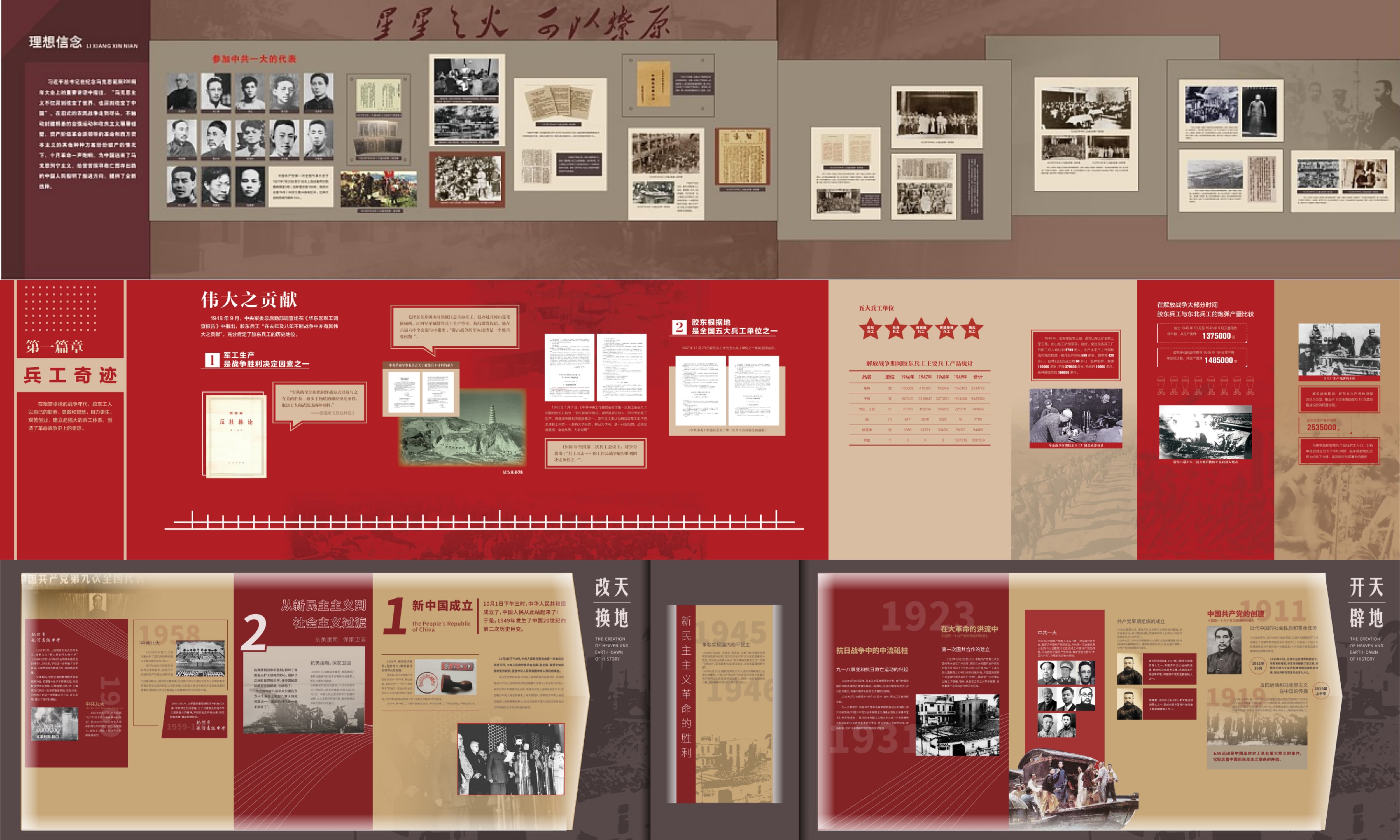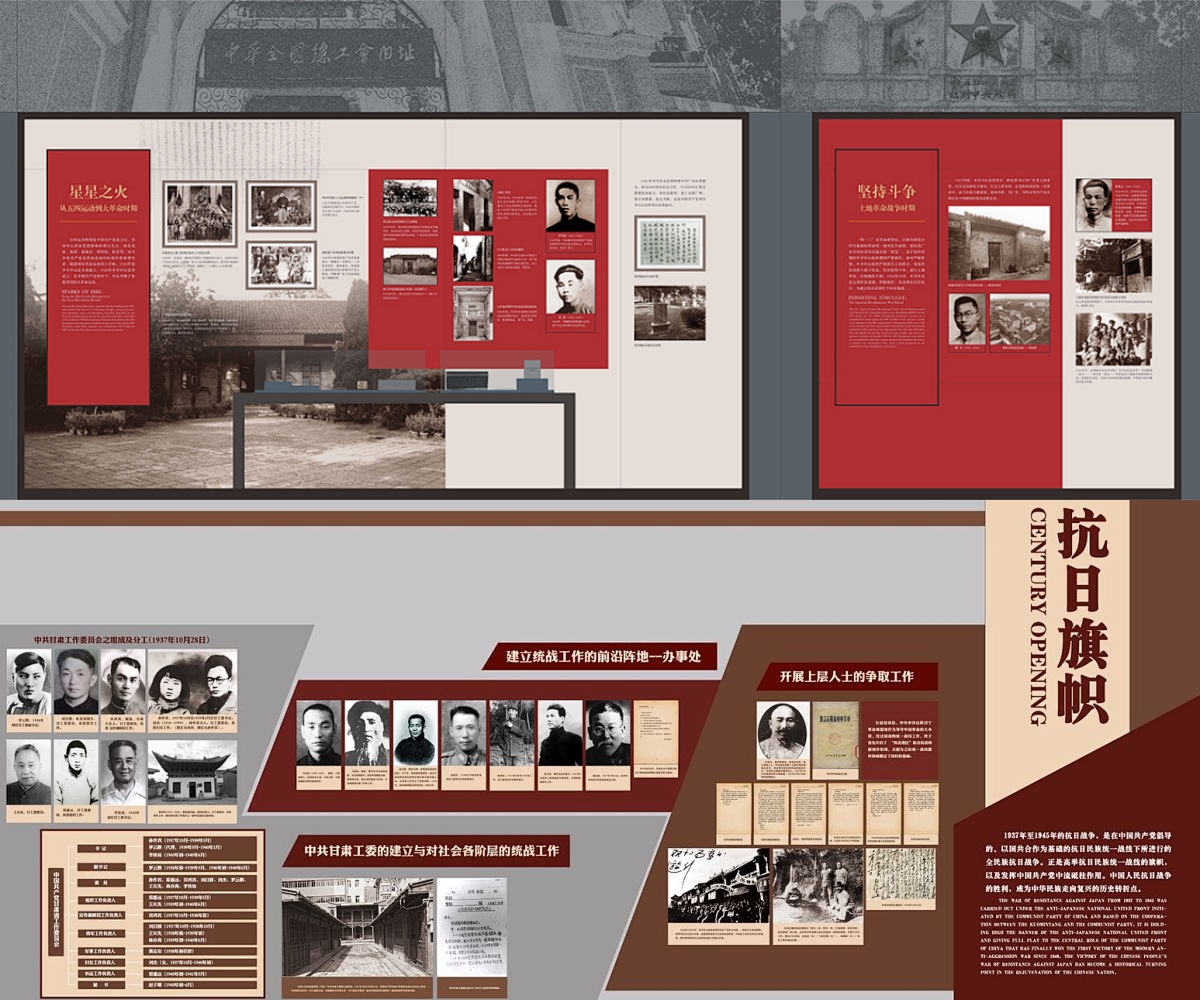 2.主体展区:按照历史时间顺序,分为若干个主题展区,如早期革命、抗日战争、解放战争等。每个展区通过不同的色彩、材质和灯光效果,营造出独特的历史氛围。