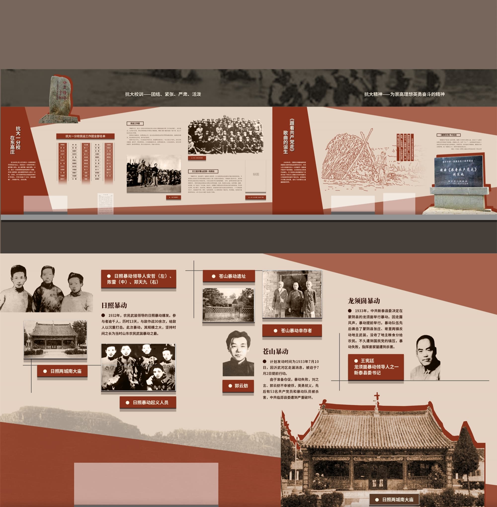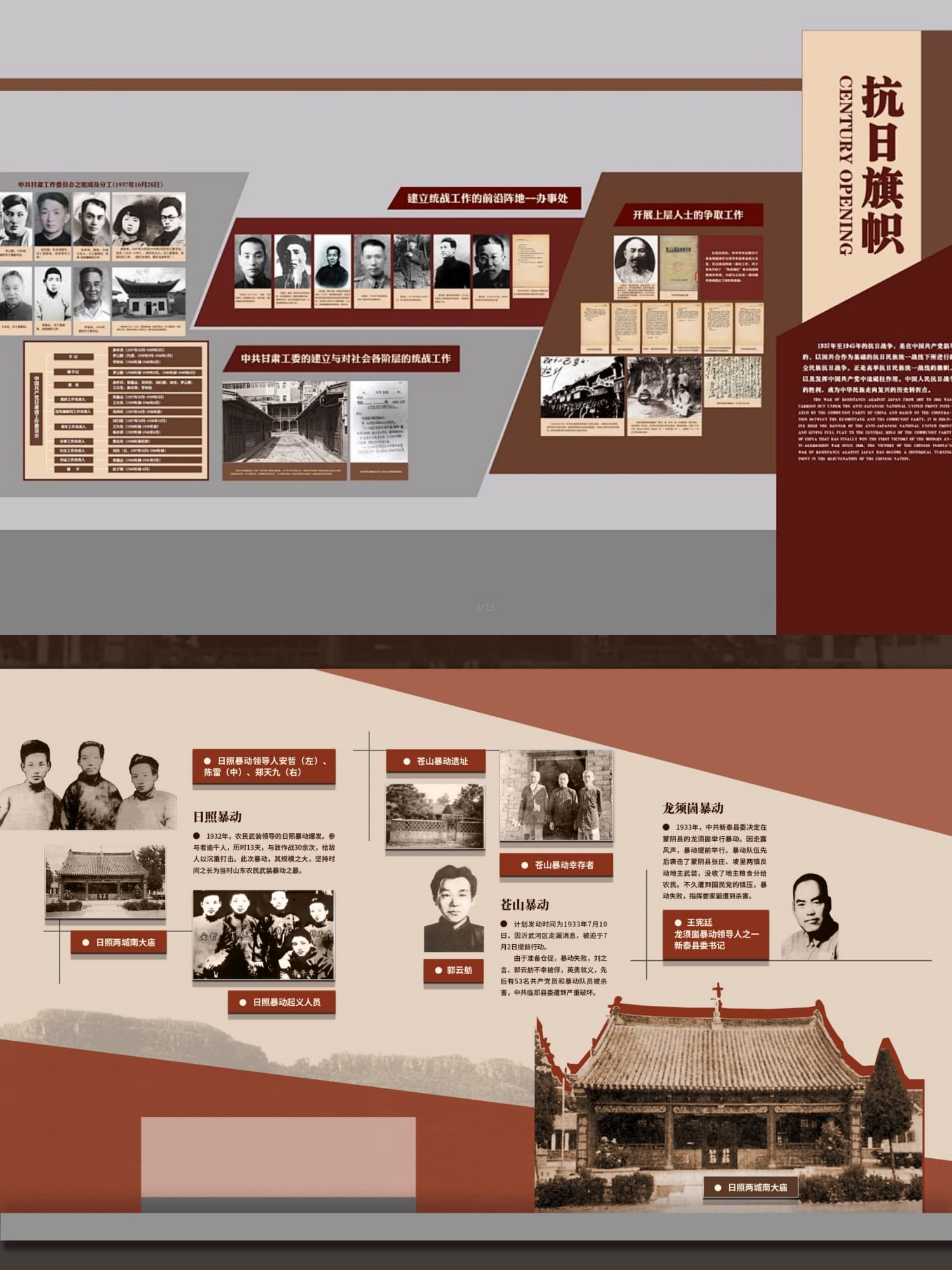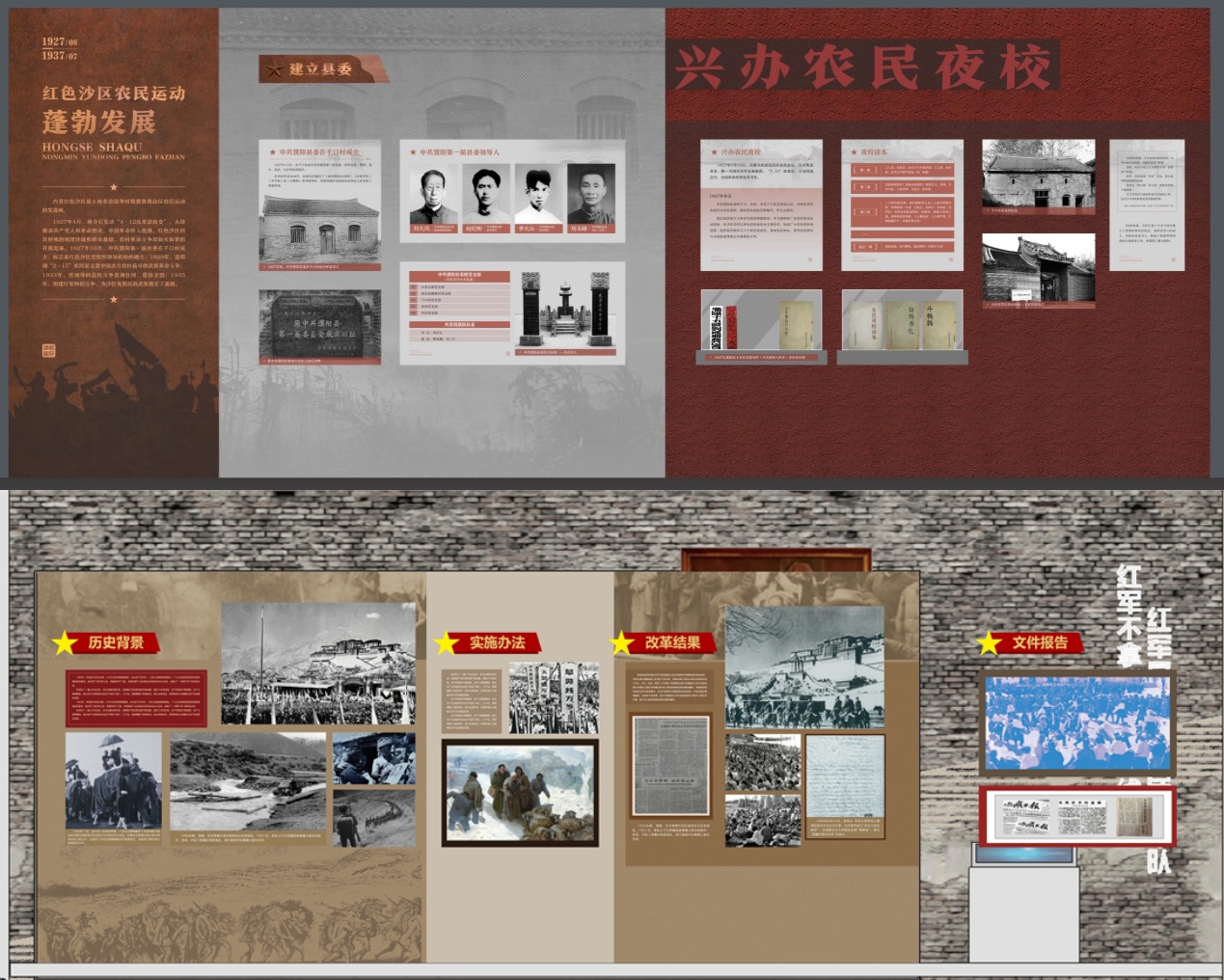 2.主体展区:按照历史时间顺序,分为若干个主题展区,如早期革命、抗日战争、解放战争等。每个展区通过不同的色彩、材质和灯光效果,营造出独特的历史氛围。