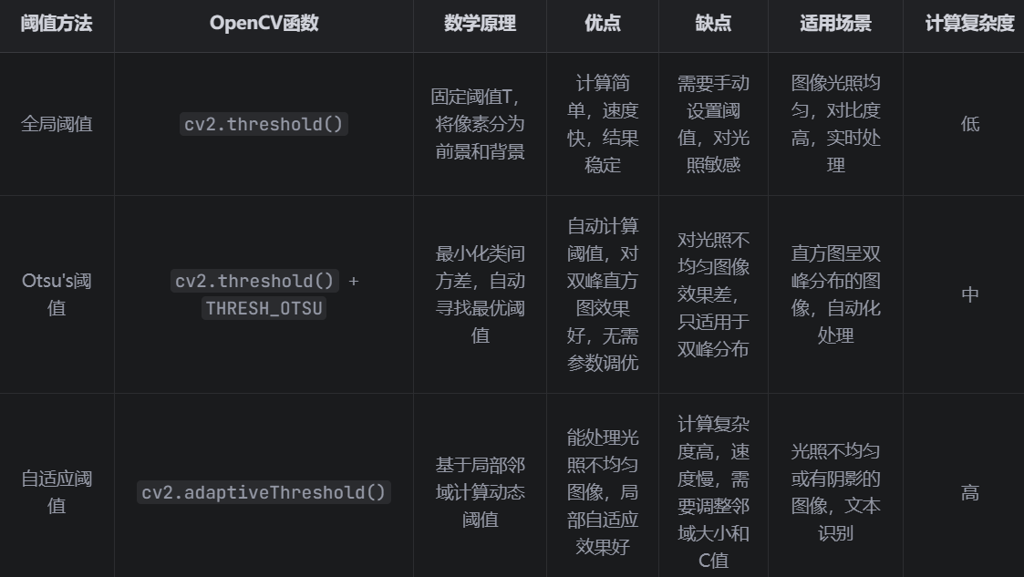 - 对光照不均匀的图像,可以尝试局部Otsu's算法或自适应阈值