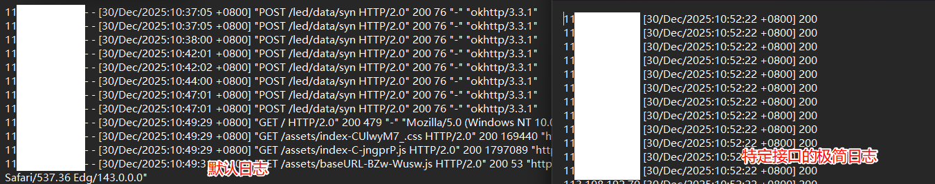 - 由于主要接收一个数据接口的推送请求,故专门对改接口 的日志 单独进行极简配置