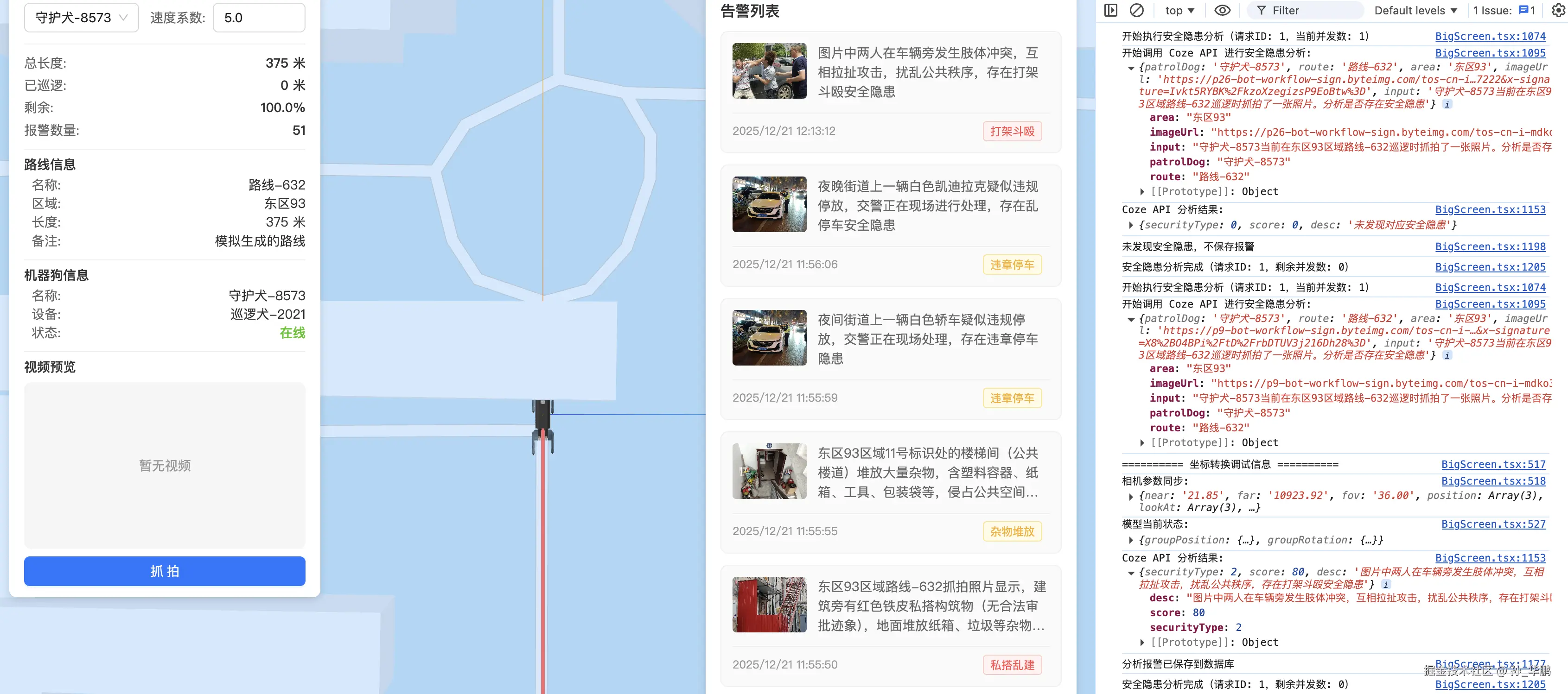 在智慧城市安全管理场景中,如何将真实的地理信息与3D模型完美结合,实现沉浸式的可视化监控体验?本文将以巡逻犬管理系统的大屏预览功能为例,详细介绍如何通过高德地图API与Three.js深度结合,实现3D机械狗模型在地图上的实时巡逻展示。