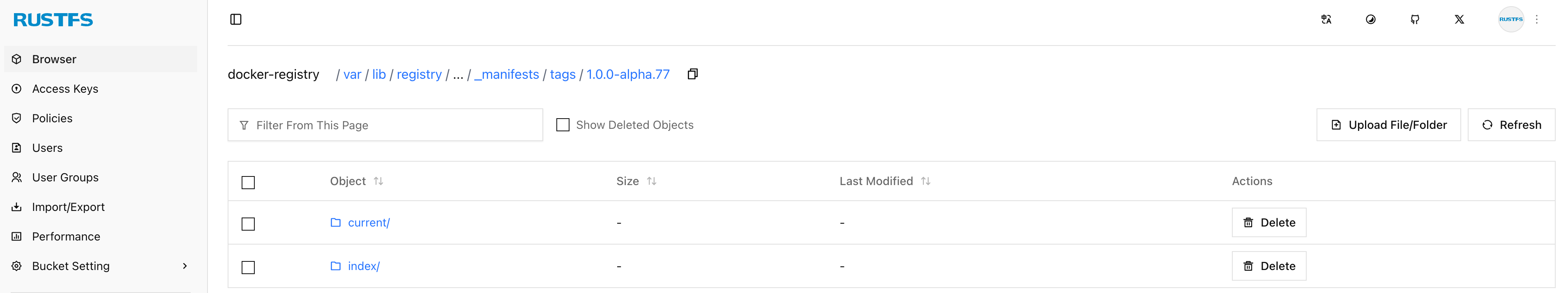 可以看到容器镜像 localhost:5000/rustfs:1.0.0-alpha.77 的相关数据已经存储到 RustFS 中了。