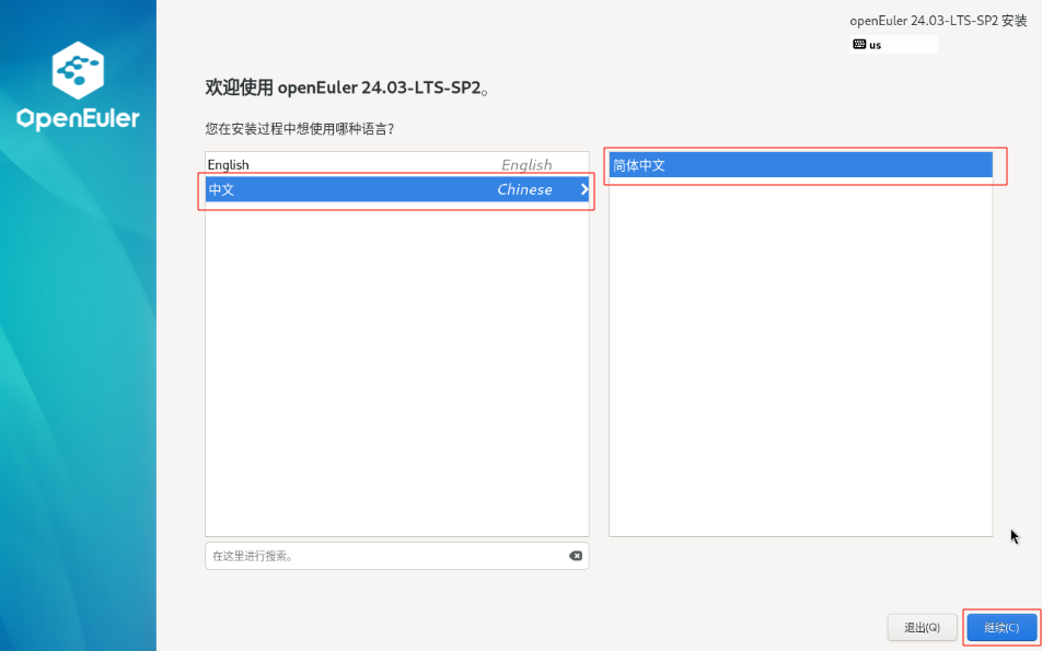 安装程序首先会要求选择语言。openEuler提供了完整的中文支持,这对于国内用户无疑是个好消息。选择"简体中文"后,整个安装界面将完全中文化。