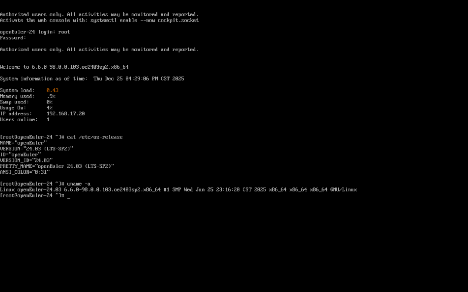 系统重启后,您将看到openEuler的登录界面。使用之前创建的普通用户或root账户登录。