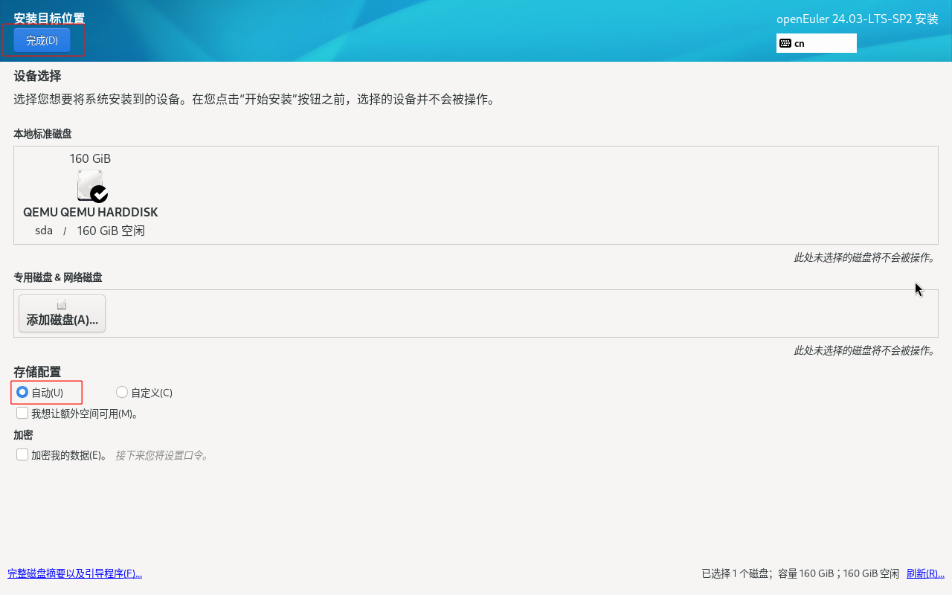 这是安装过程中最关键的一步。openEuler 提供自动分区和手动分区两种选择: