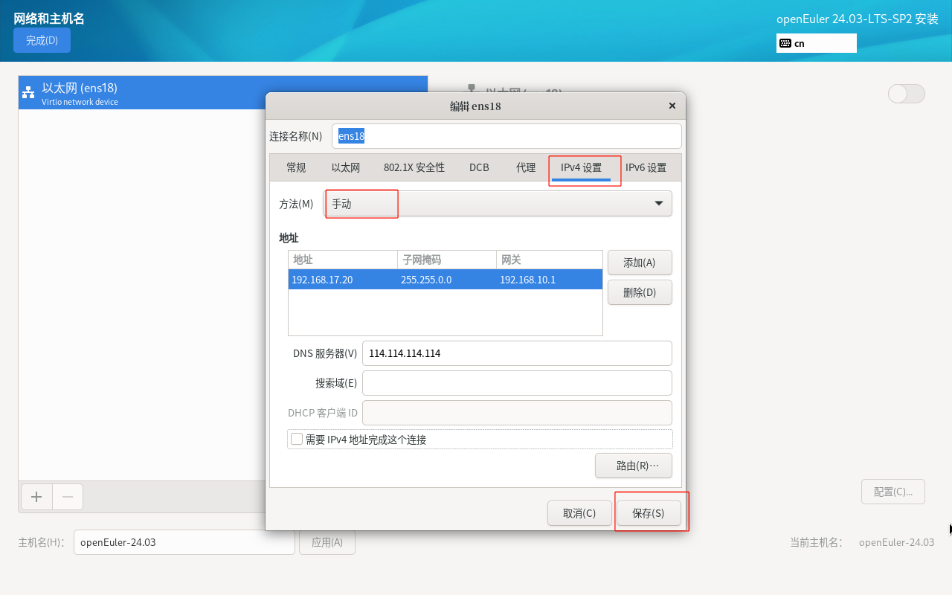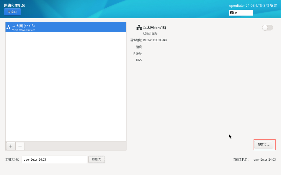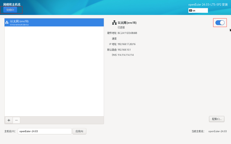 启用以太网连接,设置一个有意义的主机名,如openEuler-24.03;如果不设置主机名,默认是localhost。openEuler默认使用NetworkManager管理网络,比传统的network服务更现代化、更易用。