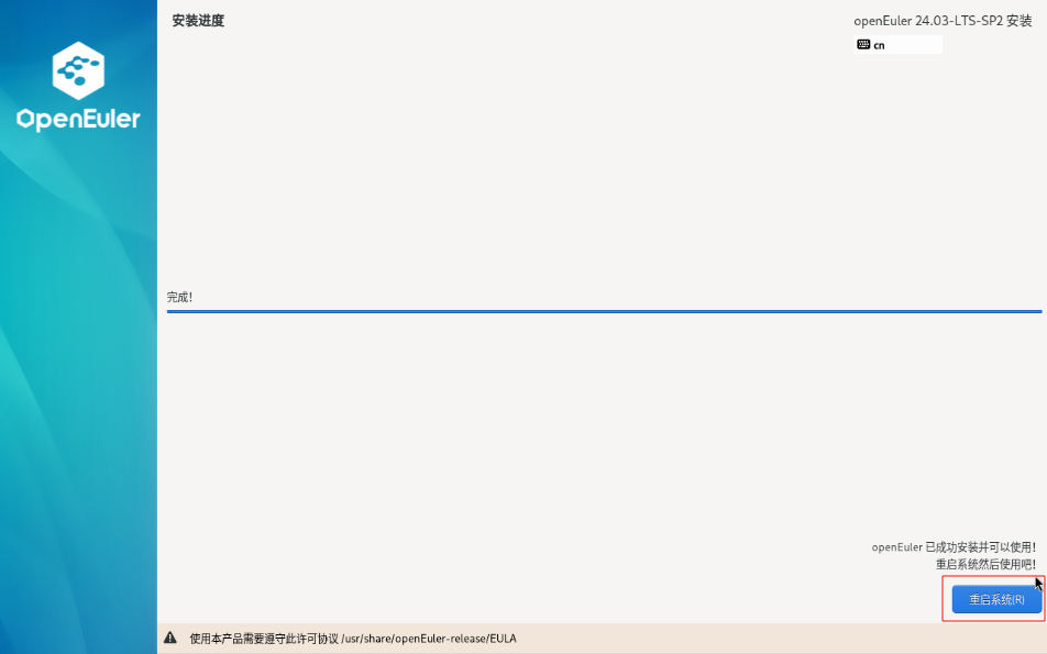 安装完成后,安装界面会提示您重启,点击重启按钮即可重启。