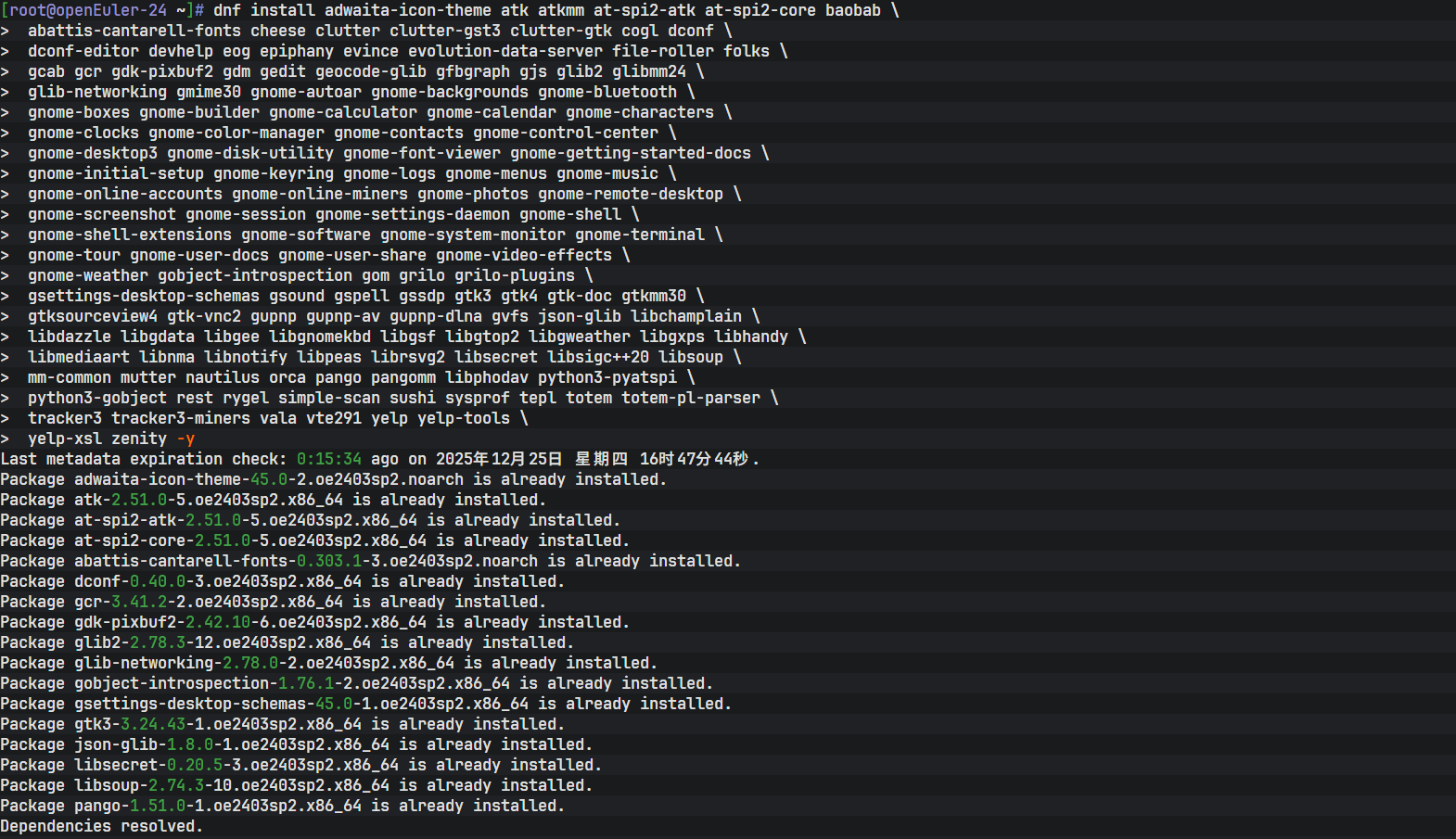 考虑到兼容性和现代特性,我们选择安装 GNOME桌面环境。接下来安装GNOME桌面环境及其必要组件: