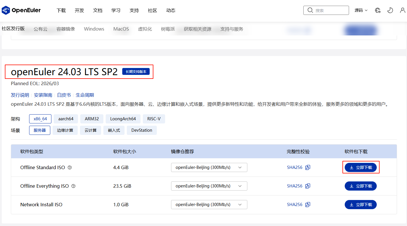 我们选择最新的稳定版本进行安装,也就是openEuler 24.03 LTS SP2。下载ISO镜像文件,大小约4-6GB。