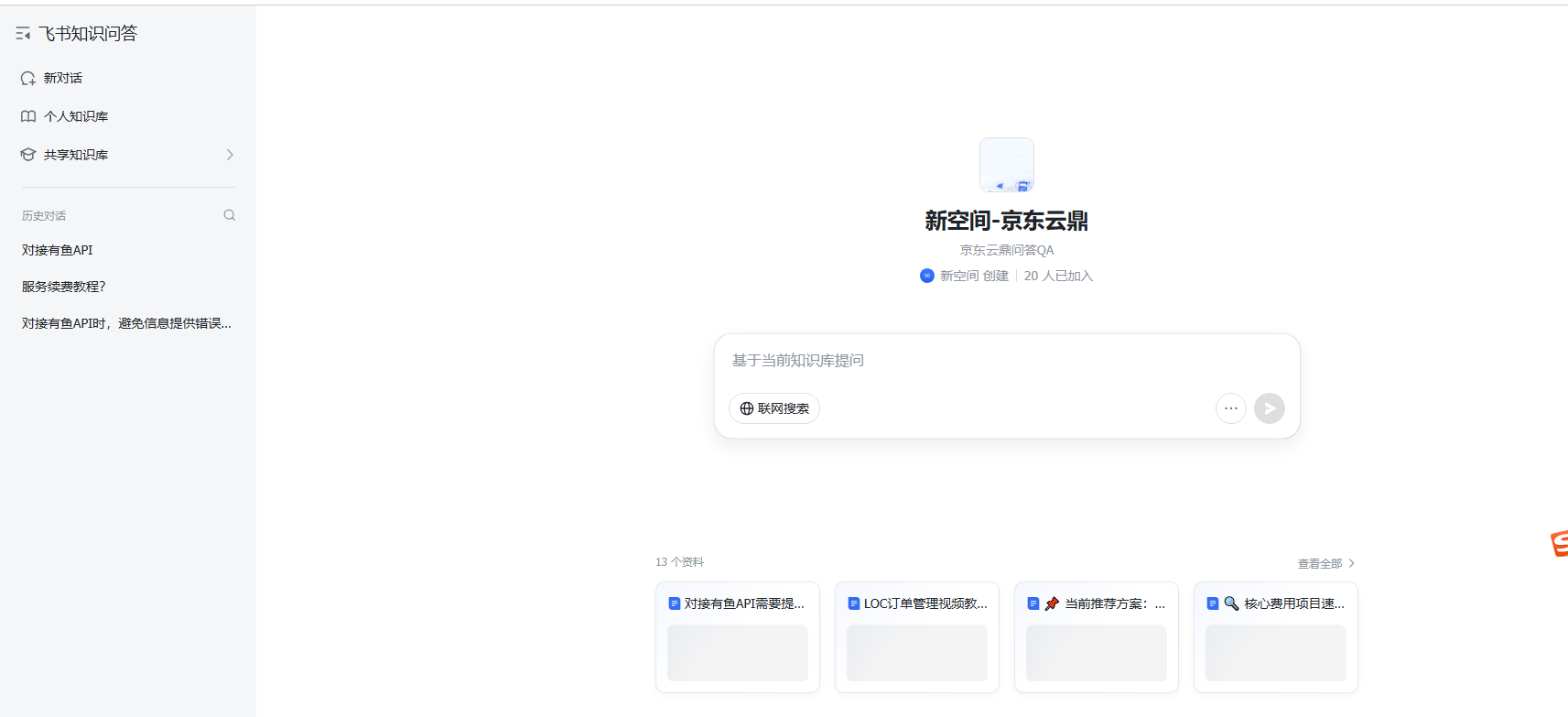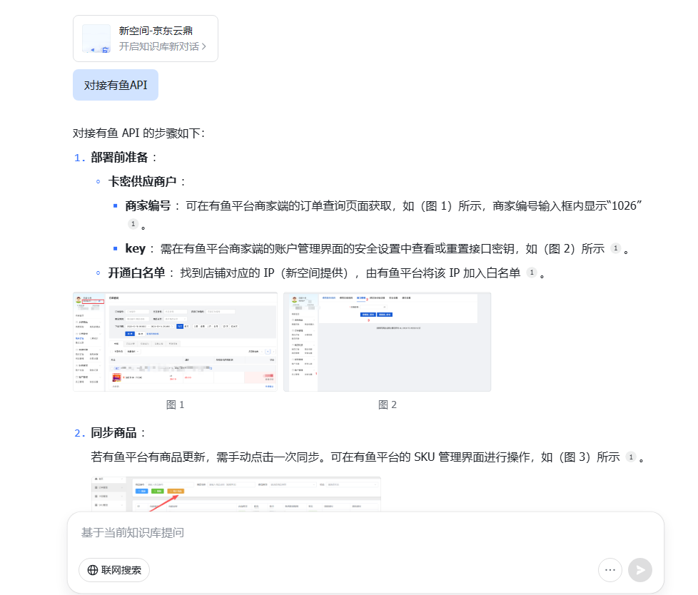 知识库设有基于当前知识库提问功能,鼓励用户针对具体问题进行深入探讨。例如,如何获取最新的云资源续费教程、京东开放平台的具体收费标准、有鱼API对接的具体要求等。