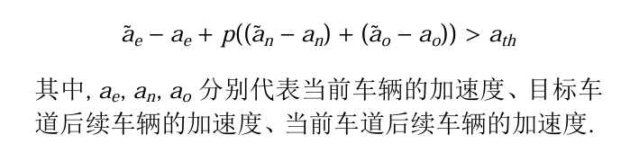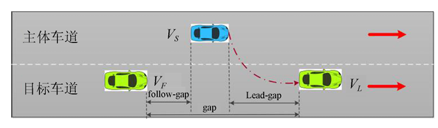 其中,dx为当前位置到达MP点的距离,vMP和aMP 分别为车辆在MP点处的速度与加速度,vs为待换 道车辆Agent的速度.当车辆到达换道点,基于车辆 间距离(gap)、车辆间相对速度以及限定AM决定是 否适合换道