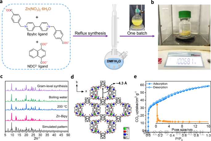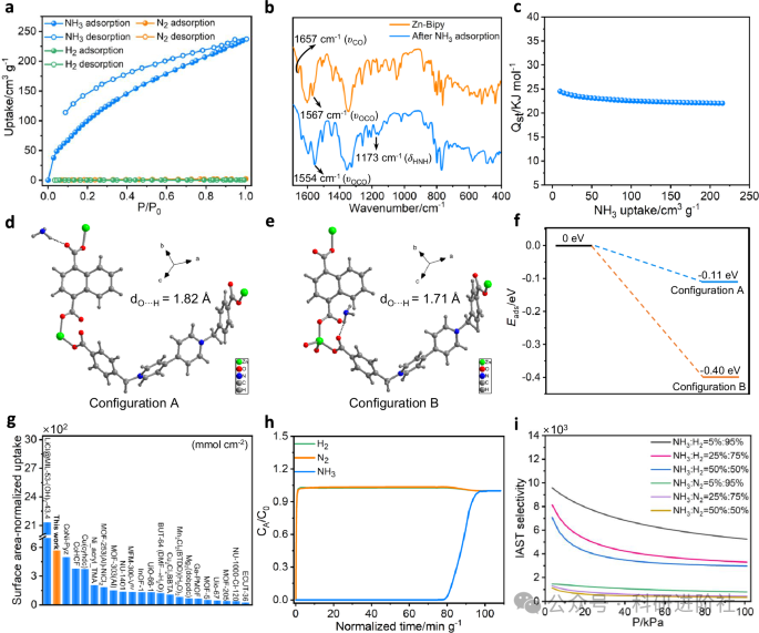 1."精准锁定"的吸附能手:传统吸附剂往往"饥不择食"。而Zn-Bipy凭借其孔道内精确定向的羧酸氧原子,能与氨气(NH₃)形成特异性氢键,实现高容量、高选择性吸附。在常温下,它对氨气的吸附量显著,而对同样存在于工业尾气中的氮气、氢气几乎"视而不见",可直接用于合成氨等工业的尾气净化,提升原料利用率。