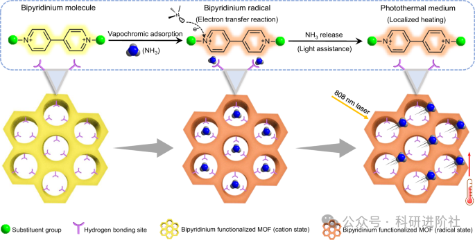 图1:联吡啶功能化MOF吸附剂中光热辅助NH₃释放示意图