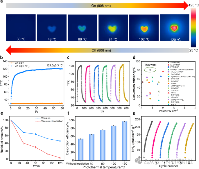 3."阳光驱动"的节能再生引擎:吸附剂的再生往往比吸附更耗能。传统MOF材料脱附氨气常需150°C以上的高温,成本高昂。本研究的革命性创新在于,吸附氨气后变色的材料,自身就成了高效的光热转换体。在808纳米近红外激光照射下,其光热转换效率突破80%,能迅速产生局部高温,温和地破坏氢键,从而在真空辅助下高效释放氨气。这为利用太阳能等绿色能源驱动吸附剂循环再生,取代高耗能的热再生工艺,开辟了全新路径。