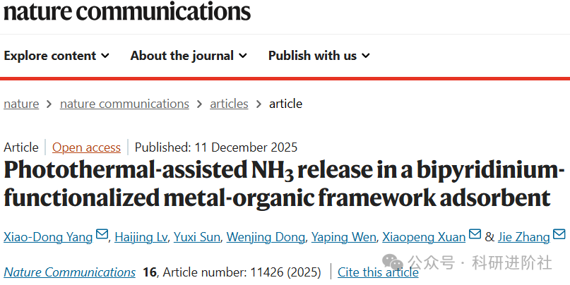 近日,国际顶尖学术期刊《Nature Communications》(https://doi.org/10.1038/s41467-025-66380-w)在线发表了一项开创性研究。由河南师范大学、青海大学与北京理工大学的科研团队联合攻关,成功研制出一种名为Zn-Bipy的新型联吡啶功能化金属-有机框架(MOF)材料。该材料集高效吸附、可视化传感、光热驱动再生三大功能于一身,为破解氨气处理领域的高能耗难题,提供了极具潜力的中国方案。