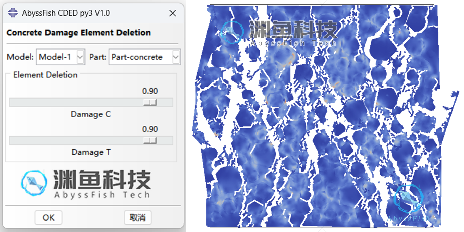 AbyssFish CDED(Concrete Damage Element Deletion)插件旨在实现混凝土损伤塑性(Concrete Damage Plasticity, CDP)材料模型中的失效单元自动删除功能,从而精确模拟混凝土损伤开裂行为。