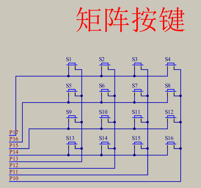 如果每个按键都要单独进行检查,那么就需要16个接口,但为了节省接口矩阵键盘是采用逐行或者逐列进行扫描,选中一行或者选中一列,然后判断该行(列)中具体哪个按键被按下然后就可以捕捉了,然后通过循环快速扫描四行(列),从而实现对所有按键进行扫描。