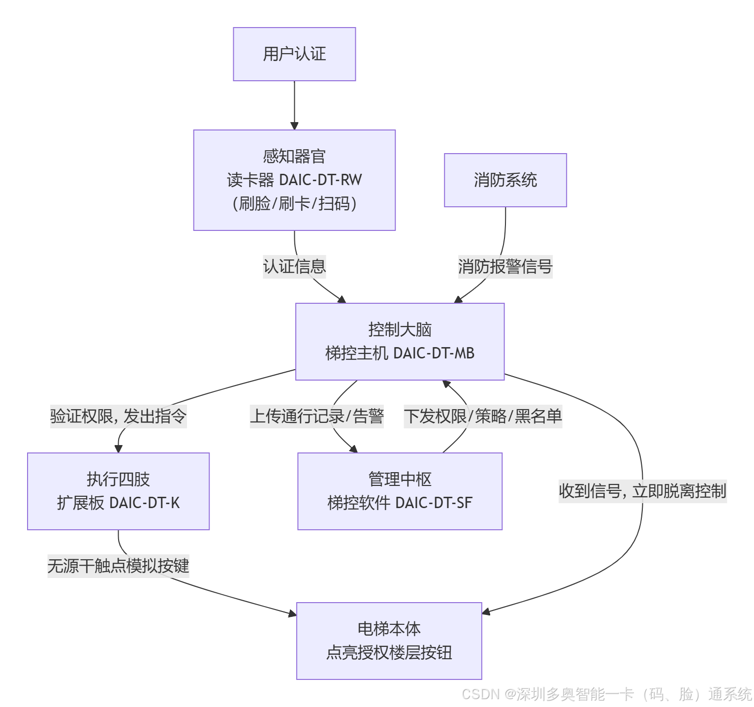 | 感知器官 | 电梯门禁读卡器 DAIC-DT-RW | 核心功能 :嵌入式安装,支持IC卡 ,可选配二维码、人脸模块。 工作模式 :RS-485通讯,支持脱机运行 (权限存储于读卡器或主机)。 选型:根据安全需求和用户体验,选择对应识别模块(卡/码/脸)。 | 采集用户身份信息的前端设备。 |