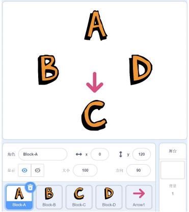 角色箭头(Arrow1)的中心点在箭头的根部,角色 Block-A 的坐标为(0, 120),角色 Block-B 的坐标为(-120,0),角色 Block-C 的坐标为(0,-120), 角色 Block-D 的坐标为(120, 0),Scratch执行下列程序,箭头指向 Block-C,如下 图所示,则红框处填写的数值是?( )