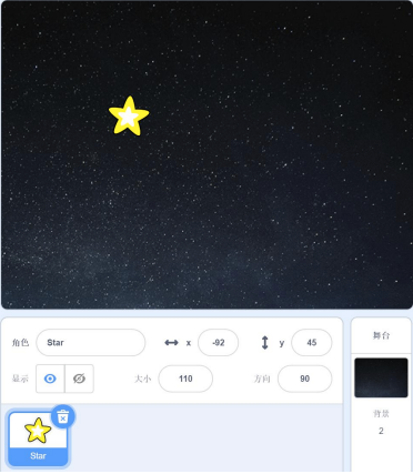 scratch角色和舞台背景如下图所示,按下一次空格键,可以看到角色星星(Star) 有什么变化?( )